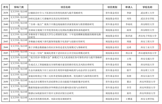 教育部人文社会科学研究项目是我国人文社科领域极具分量的高级别科研项目,是衡量高校人文社科研究水平与综合实力的关键标志之一。汶希副教授获批的课题《基于多模态数据融合的社区体育适老化发展模式与策略研究》,直面我国人口老龄化的重大社会需求,具有鲜明的前沿性和交叉学科特色。综合运用多源数据,深入探究如何构建与优化适合老年人身心特点的社区体育服务模式,为推动“健康中国”与“积极老龄化”国家战略的落地提供了前瞻性的理论支撑和实践路径。